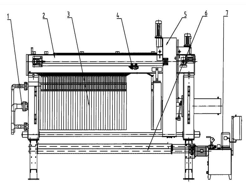 隔膜式壓濾機主要由框架系統、液壓系統、濾板濾布系統組成。